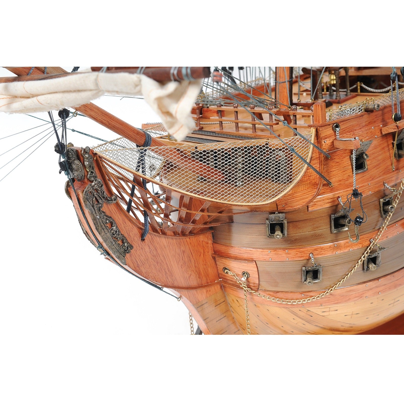 The H.M.S. Victory was the ultimate British fighting vessel: a full rigged 227 feet long ship with 104 guns and 850 men when at full capacity. It is able to move from 15 to 17 kilometers per hour, and weighed as heavy as 7 tons, including guns. It was launched in 1765 and was most famous as Admiral Horatio Nelson’s flagship at the Battle of Trafalgar in 1805. Nelson was shot and killed during the battle. H.M.S. Victory is the oldest naval ship still in commission. It has been restored and rests in a dry dock at Portsmouth, England. The ship in Portsmouth is the sixth ship with the name Victory in the Royal Navy. There has been great interest in the fifth Victory ship, which was built 15 years earlier and whose wreckage was found recently by Odyssey Marine Exploration.Note: This item ships direct from California to contiguous 48 states only.