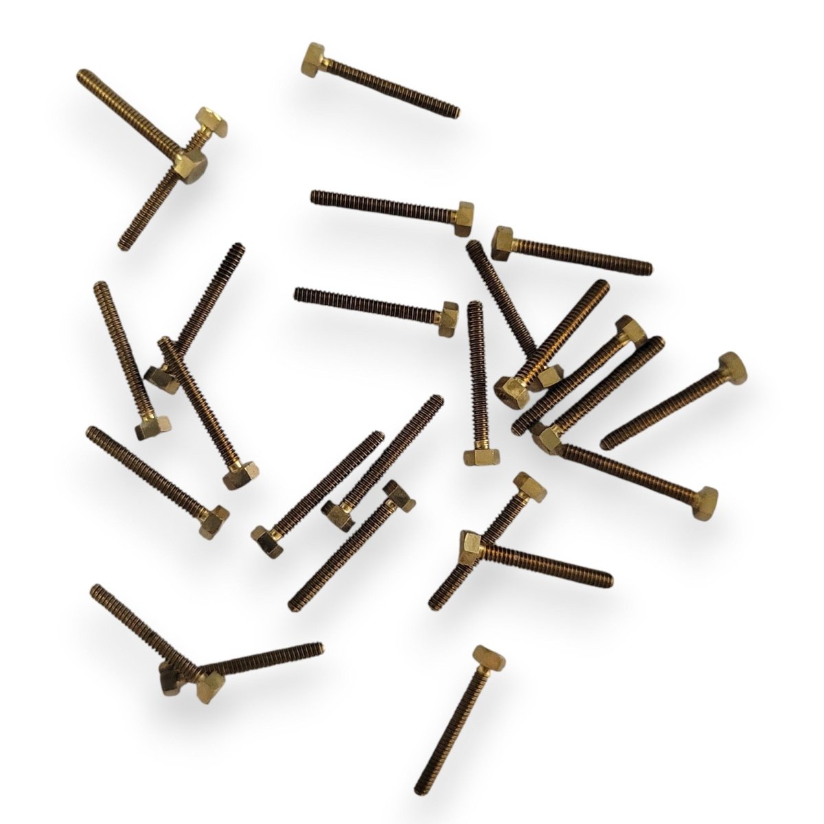 Miniature brass machine screws with hex heads. 25 per package. Made in the USA.
