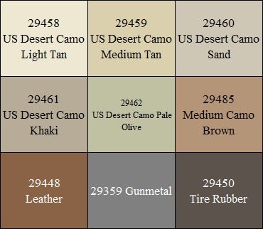 - Includes foundational shades such as US Desert Camo Sand and US Desert Camo Khaki plus supporting tans, browns, and olives.