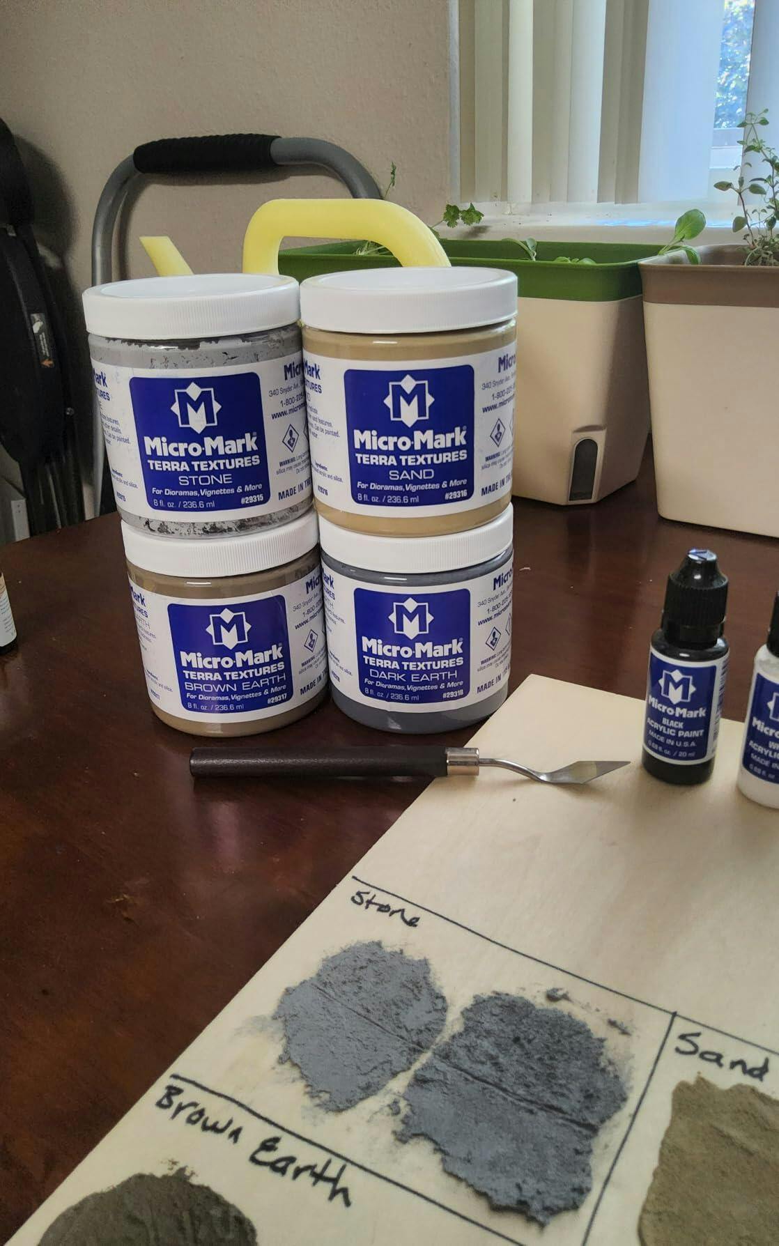 Micro-Mark Terra Textures are appropriate for reproduction of ground textures on diorama and vignette bases. This texture is acrylic-based and can be mixed with other products including Micro-Mark Acrylic Paints both brush-on and airbrush. The Terra Textures are also compatible with most other acrylic paint brands. Surface should be clean, dry, and free of loose particles. Cure time depends on the thickness applied. Terra Textures can be mixed with each other to create desired effects. Clean up skin and tools easily with soap and water. 8-ounce jars have at least a 2-year shelf life when stored properly.
