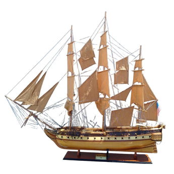 Display this gorgeous œOld Ironsides� right in your own home or office! The U.S.S. Constitution, a legend in the War of 1812, is available as a museum-quality, FULLY ASSEMBLED model. This is an œExclusive Edition� where the model has a unique serial number etched into the hull, which allows us to identify production date, material used and all other production information of a model. Master craftsmen using historical photographs, drawings or original plans meticulously handcraft these highly detailed wood models from scratch. They are built to scale with high-grade wood such as: western red cedar, rosewood, and mahogany. They are 100% hand built individually using plank-on-frame construction method and are similar to the building of actual ships. Each model requires hundreds of hours to finish and must go through a demanding quality control process before leaving the workshop. This amazing model of the USS Constitution XL features plank on frame, two decks, and one stretched ferocious row of metal cannons on each side of the ship. The front bowsprit and three large masts are connected securely using advanced rigging and lines painstakingly knotted and fastened by hand. Each yard has an attached hand-stitched rolled-up sails made of fine linen. The glorious American flag are attached to the mizzen yard. Metal anchors and a wooden rudder are visible on the front and rear of the ship. On the deck, there are authentic hand-built lifeboats with ribs and planks, stationed metal cannons, metal steering wheels, metal bell, captain's dining and sleeping cabin, and many other handcrafted ornaments. There is also an exquisite, detailed admiral's quarter on the stern with spectacular brass ornaments. This model comes standard with a solid wood base and brass nameplate. It'll make a perfect gift for home or office decorator, boat enthusiast or passionate collector.