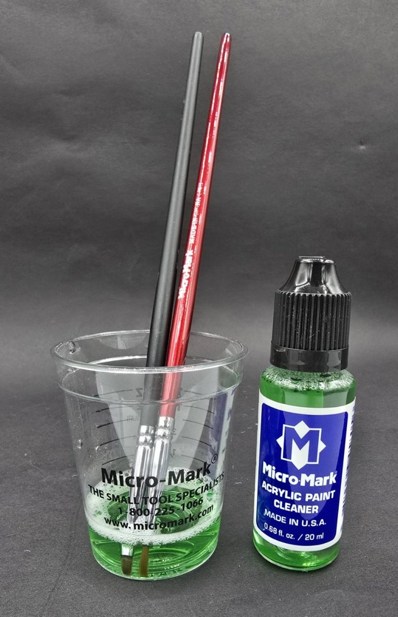 Answer: Flush with Micro-Mark Acrylic Cleaner immediately after painting. For deeper cleaning, disassemble and soak parts before rinsing.