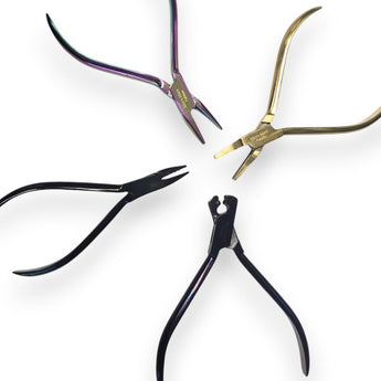 Our set will make loops, rings, S, C, Z, L and just about any other shape. Set bends strip stock up to 1/32 inch thick and wire up to 3/32 inch. The strange looking plier at the top of the photo will even bend hardened music wire. Made of polished stainless steel with box joints that keep jaws in alignment. Orthodontists use these and pay about $41.00 each from dental supply houses. We buy directly from the manufacturer. The result is a set of incredibly useful, well-made tools at a great price.